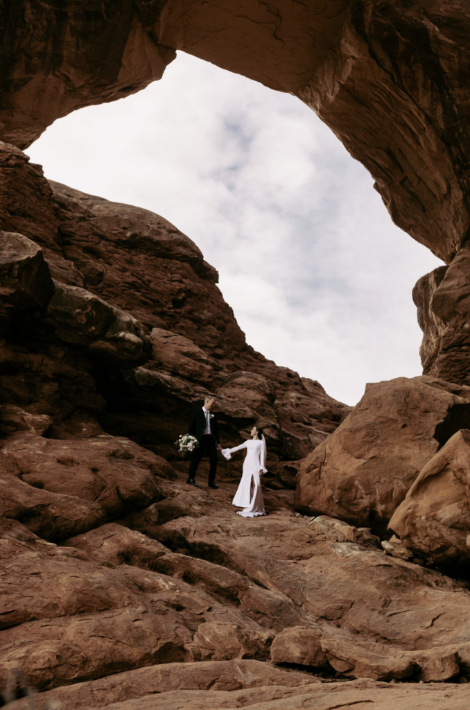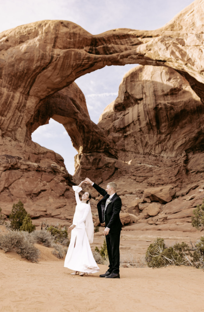 Last and most certainly not least… and may or may not be my favorite, is Moab! This location is a bit different from the other two, but in a very good way! Instead of thinking of regular mountains with gray boulders, rough terrain, and pine trees, think of Moab as red rock mountains with smooth desert terrain. With its iconic red rock formations, towering mesas, and expansive desert vistas it makes a stunning scene for all weddings. Personally, it is one of the most captivating destinations that I have shot at and exudes rugged beauty and timeless romance. Moab offers a one-of-a-kind setting for couples seeking truly the most memorable wedding and elopement experience… and I have the pictures to prove it! See below, one of my beautiful couples wedding day with Moab’s sandstone arches and the glow of a desert sun shining through. I am saying and showing you all of this to say that the natural beauty of Moab will leave you and your guests in awe and will always be a wedding they will remember and talk about forever!